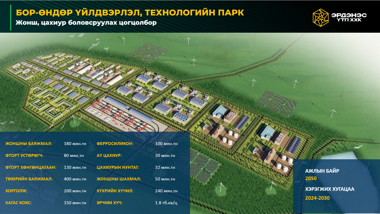 Хэнтий аймгийн Бор-Өндөр сумын нутагт жонш баяжуулах, боловсруулах, химийн үйлдвэрлэлийн чиглэлээр Бор-Өндөр үйлдвэрлэл, технологийн паркийг байгуулж, 97%-аас дээш агуулгатай баяжмал, фторт устөрөгч, фторт хөнгөн цагаан, фторт бүтээгдэхүүн, төмрийн хүдэр боловсруулах чиглэлд нойтон соронзон аргаар төмрийн хүдрийг баяжуулах, төмрийн хорголж хийж Дарханы ган төмөрлөгийн цогцолборт нийлүүлнэ. Мөн цахиурын түүхий эдийг боловсруулах, ферросиликон болон аж үйлдвэрийн цахиур зэргийг үйлдвэрлэн экспортыг нэмэгдүүлнэ.
