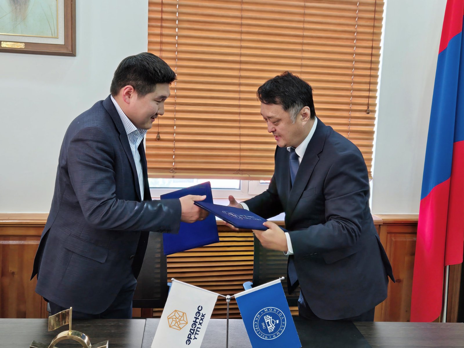 “Эрдэнэс ҮТП” ХХК болон Монгол Улсын Их Сургууль хамтран ажиллах Санамж бичиг байгууллаа. Санамж бичигт “Эрдэнэс ҮТП” ХХК-ийн Гүйцэтгэх захирал Н.Мөнх-Идэр, Монгол Улсын Их Сургуулийн Ректор Б.Очирхуяг нар гарын үсэг зурав.