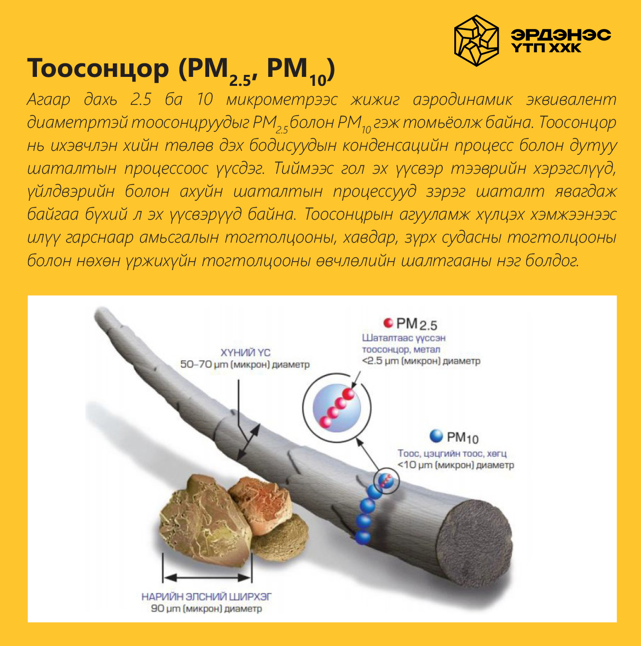 Япон улсын Олон улсын хамтын ажиллагааны байгууллага Жайкагийн Улаанбаатар хотын агаарын бохирдлын хяналтын чадавхыг бэхжүүлэх төслийн тайланд агаарыг бохирдуулагч үндсэн бодисын нэг нарийн ширхэглэгт тоосонцрын (PM2.5) 80% нь гэр хороололд түлэх түүхий нүүрсний хэрэглээнээс ялгарч байна. Үлдсэн 20%-ийг нам даралтын зуухнууд, тээврийн хэрэгсэл, дулааны цахилгаан станц, шороон замаас дэгдэх тоос зэрэг бүрдүүлдэг гэжээ.