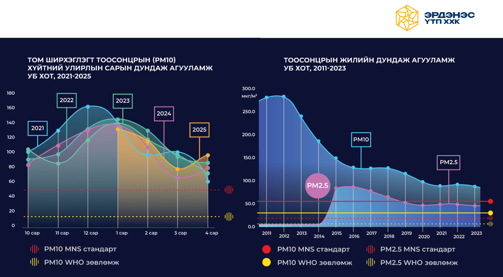 Цаг уур орчны шинжилгээний газрын Улаанбаатар хотын агаарын чанарын төлөв байдлын тоймд (2025) мэдээлснээр сүүлийн 5 жилд буюу 2021-2025 оны хүйтний улирлын 10-4 дүгээр сар хүртэл агаар бохирдуулагч бодисын сарын дундаж агууламж 12, 1, 2 дугаар саруудад хамгийн өндөр агууламжид хүрсэн байна. Энэ нь өвлийн энэ саруудад хүйтний эрч чангарч, хатуу түлшний хэрэглээ нэмэгддэгтэй холбоотой. Бохирдуулагч бодис тус бүрээр авч үзвэл тоосонцор (PM10, PM2.5) хүйтний улиралд Монгол Улсын стандартаас (MNS) 1.2-4.8 дахин их, ДЭМБ-ын зөвлөмж хэмжээнээс (WHO) 3-24 дахин их, азотын давхар исэл (NO2) WHO-ээс 2.5-7 дахин их, хүхрийн давхар исэл (SO2) MNS-аас 1.2-10 дахин их агууламжтай байна.