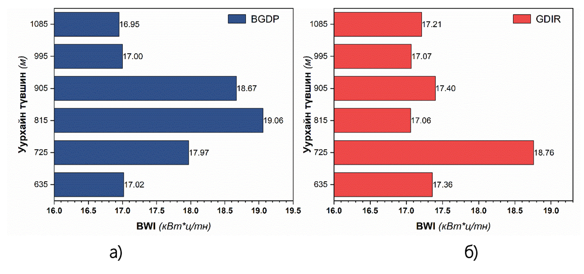 - Физик-механик болон хими-минералогийн судалгааг 1175-635 м-ийн түвшний дээжүүдэд гүйцэтгэсэн бөгөөд Бондын ажлын индекс эрс нэмэгдэж байгааг тогтоов. Үүнд хамгийн их нөлөө үзүүлж буй эрдсүүд хоорондын харилцан хамаарлыг “Пирсон корреляцийн коэффициент”-оор тодорхойлсон. Уурхайн гүн 995 м-ээс доош үед хүдрийн Бондын ажлын индекс нь 19.06 кВт*ц/т хүртэл нэмэгдэж буйг лабораторийн туршилтаар тогтоосон.