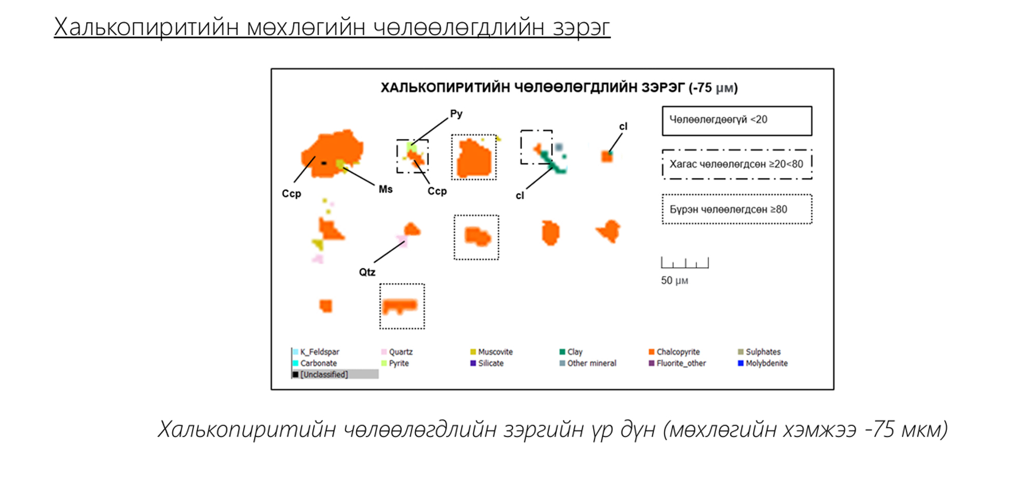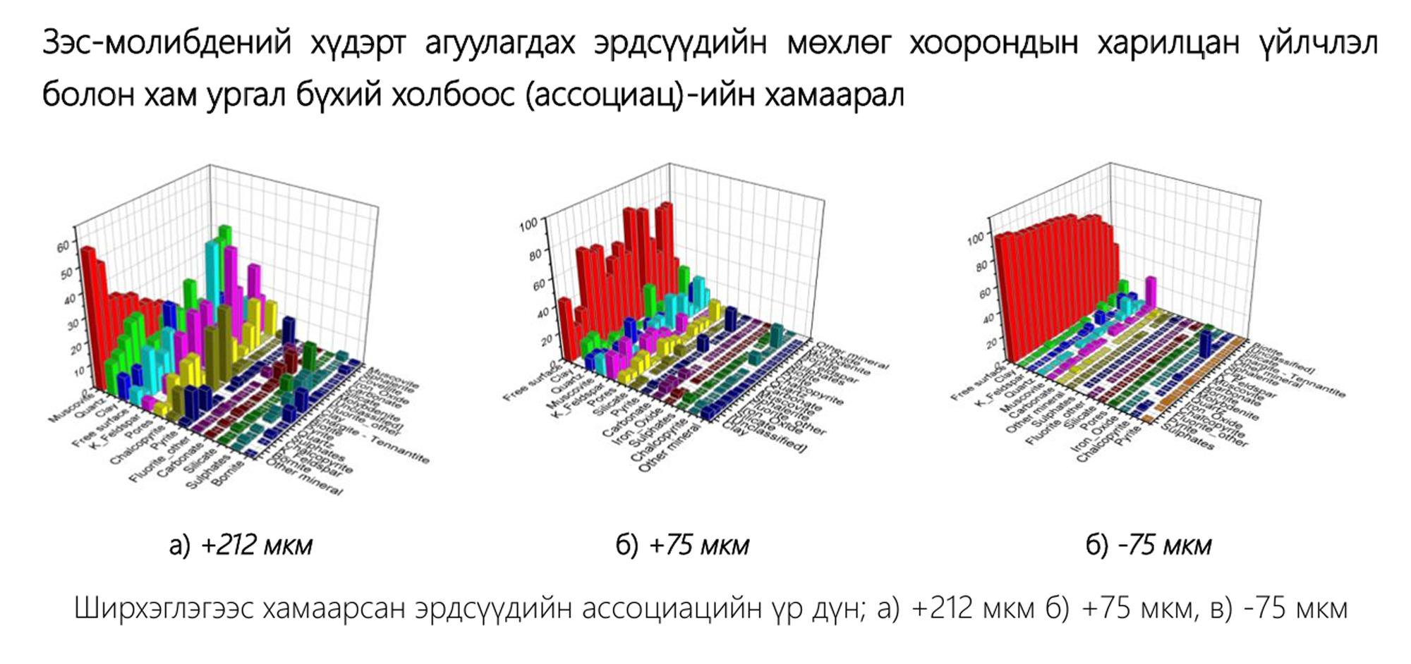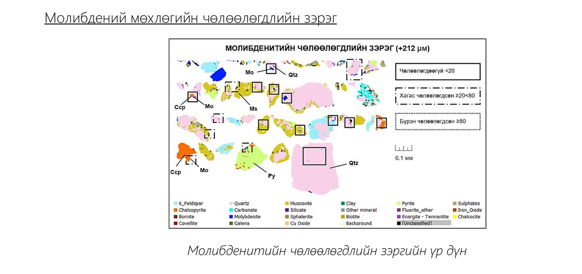 - Зэсийн металл авалт баяжмалд 91.05%, хаягдалд 8.95%, молибдений хувьд баяжмал дахь металл авалт 77.64%, хаягдалд 22.36% байна. Туршилтын дүнгээс харахад халькопирит, пирит, анхдагч ба зэс агуулсан бусад эрдсийн чөлөөлөгдөлтийн зэрэг нь ширхэглэлийн анги буурах тутам ихсэж байгаа бол молибденийн хувьд эсрэгээрээ ширхэглэгийн анги хамгийн том буюу +212 мкм үед хамгийн өндөр утгатай болохыг тогтоосон.